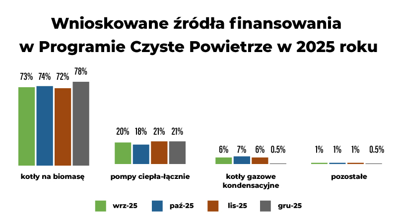Rok 2025 przyniósł wyraźne zmiany w strukturze źródeł ciepła wybieranych przez beneficjentów programu "Czyste Powietrze". Największym zwycięzcą okazały się kotły na biomasę, które osiągnęły bezprecedensową dominację. Udział pomp ciepła ustabilizował się, natomiast kotły gazowe praktycznie zniknęły z systemu wsparcia.